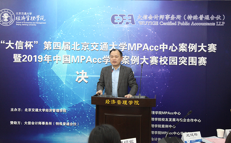 On March 3, the fourth "WUYIGE Cup" MPAcc student case competition was successfully held in Beijing Jiaotong University. Yonghua Hu, chief partner of WUYIGE CPA firm; Hong Li, general auditor; Weiwei Wang, technical partner; Yongmei Cui, vice president of Economics and Management Department; Lizhi Xue, deputy manager of China Railway Construction International Group Co.,Ltd and chief accountant attended the event and presented as the judges of the competition.