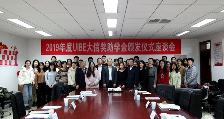On January 3, 2020, Hu Yonghua, chairman of Daxin Global held a ceremony of awarding scholarships and bursaries of 2019 in the school administration building with Professor Wenjun Ji, Vice-Chancellor and Professor Wang Tiedong, Dean of International Business School of University of International Business and Economics